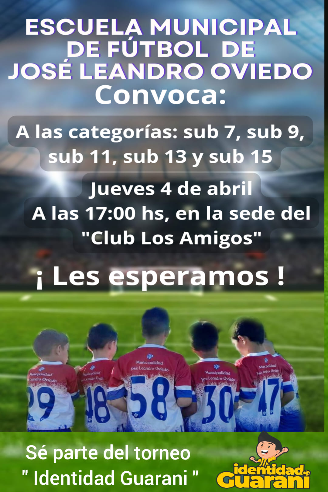La Escuela de Fútbol Municipal, abre convocatoria para las categorías sub 7, 9, 11, 13 y 15, para participar del Torneo ” IDENTIDAD GUARANI “ Les esperamos Jueves 4 de abril 17:00 hs. Club de amigos. Administración Municipal Prof. Javier Morán #JuntosSeguimosCreciendo